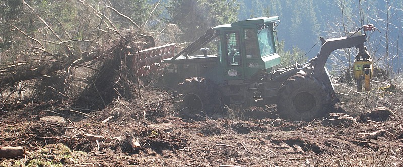 Das Ast- und Kronenmaterial wird auf Wälle geschoben und kann auf Wunsch mit einem Forwarder zur Hackschnitzelverarbeitung aus der Fläche entfernt werden.